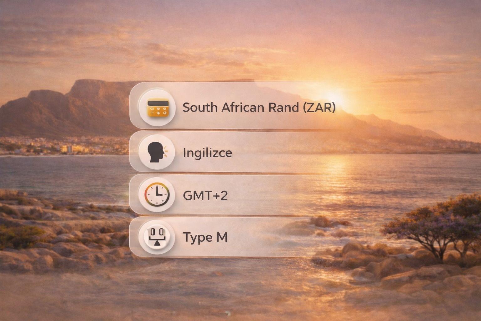 Para birimi: South African Rand (ZAR). Dil: İngilizce. Saat dilimi: GMT+2. Priz tipi: Type M. Trafik soldan akar. Ödeme yöntemi olarak kredi kartı her yerde geçmektedir.